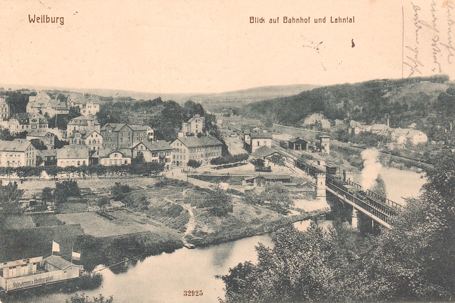 ![]() Bild I.5 – Eine 1918 gelaufene Ansichtskarte mit ähnlichem Blick wie Bild I.1. Die Lokschuppentore stehen offen, rechts danbeben steht ein Wasserturm (?) und über die Brücke dampft ein Zug in Richtung Limburg. Ganz links vorne ist der Ponton der „Schwimm- und Badeanstalt“ zu erkennen, Vorläuferin des heutigen Hallenbades. (1918 – © Sammlung CK) |