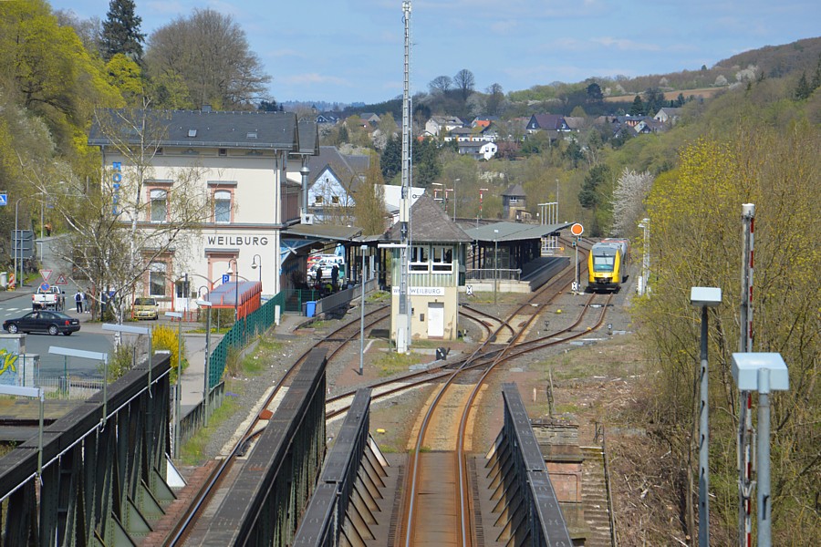 Von den Zinnen des Tunnelportals geht der Blick über den Weilburger Bahnhof nach Norden. Mitten zwischen den