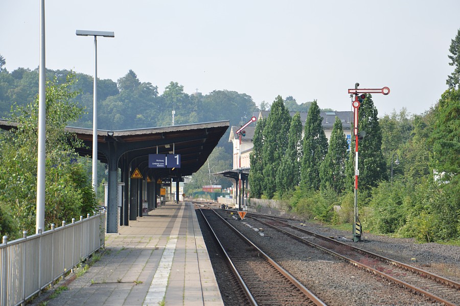 ![]() Bild II.6 – Ein ähnlicher Blick wie im Bild II.4, fast 15 Jahre später. Von den einst ausgedehnten Gleisanlagen an der rechten Seite ist ein Überholgleis geblieben, die hohen Sperrsignale sind verschwunden. (31. 7. 2014 – CK) |
