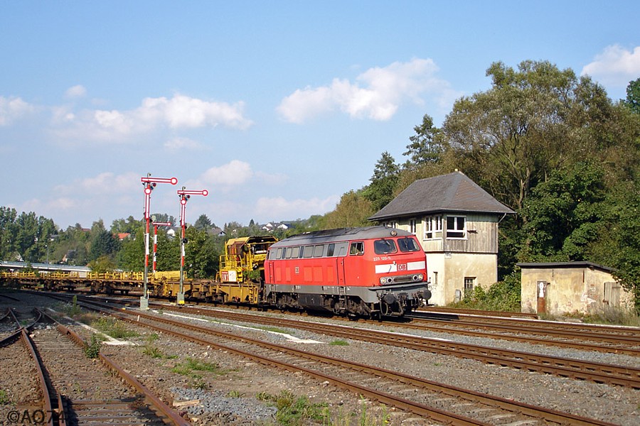 – 225 120 schleppt einen langen Bauzug am Stellwerk „Wo“ vorbei nach Weilburg hinein. Links im Vordergrund sind noch Reste der Ladegleise zu erkennen; inzwischen sind sie verschwunden.