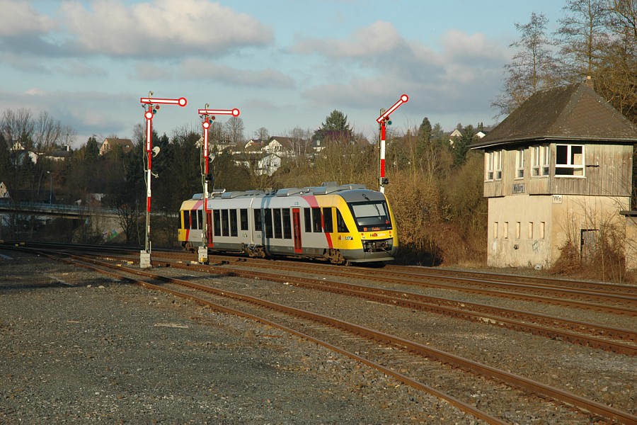 – Ausfahrt frei für die spätnachmittägliche Regionalbahn nach Fulda; die Leistung wird inzwischen von der Hessischen Landesbahn (HLB) mit LINT-Triebwagen gefahren.