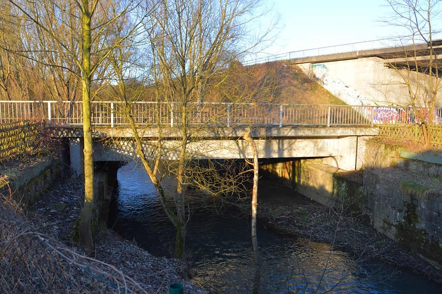 Das späte Februarlicht lässt die schlichte Betonbrücke golden leuchten. Der Betonüberbau ersetzt zweifellos eine