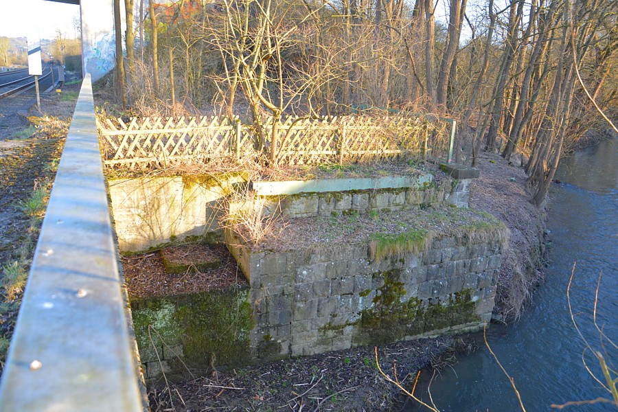 – Das östliche Widerlager der zweiten, südlich anschließenden Querung des Solmsbaches. Neben den Streckengleisen der Lahntalbahn verlief hier das Gleis zu den Güteranlagen und zum Anschluss der Georgshütte.