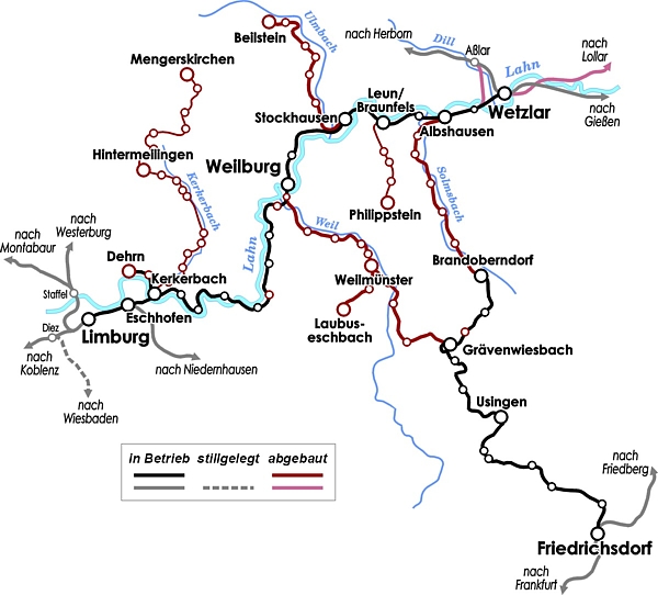 Diese Karte zeigt alle hier dargestellten Bahnstrecken und ihre Einbindung in das umgebende Netz. Sie können die einzelnen Strecken anklicken und kommen dann direkt auf die Übersichtsseite der entsprechenden Strecke.